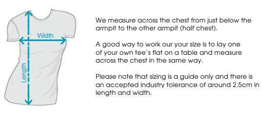 FIT: Relaxed fit - please check the size chart to avoid disappointment. Lay your own tee flat on a table, measure armpit to armpit across the chest and match to the size you feel is best. Please note measurements can vary within 2.5cm, this is within the accepted tolerance.