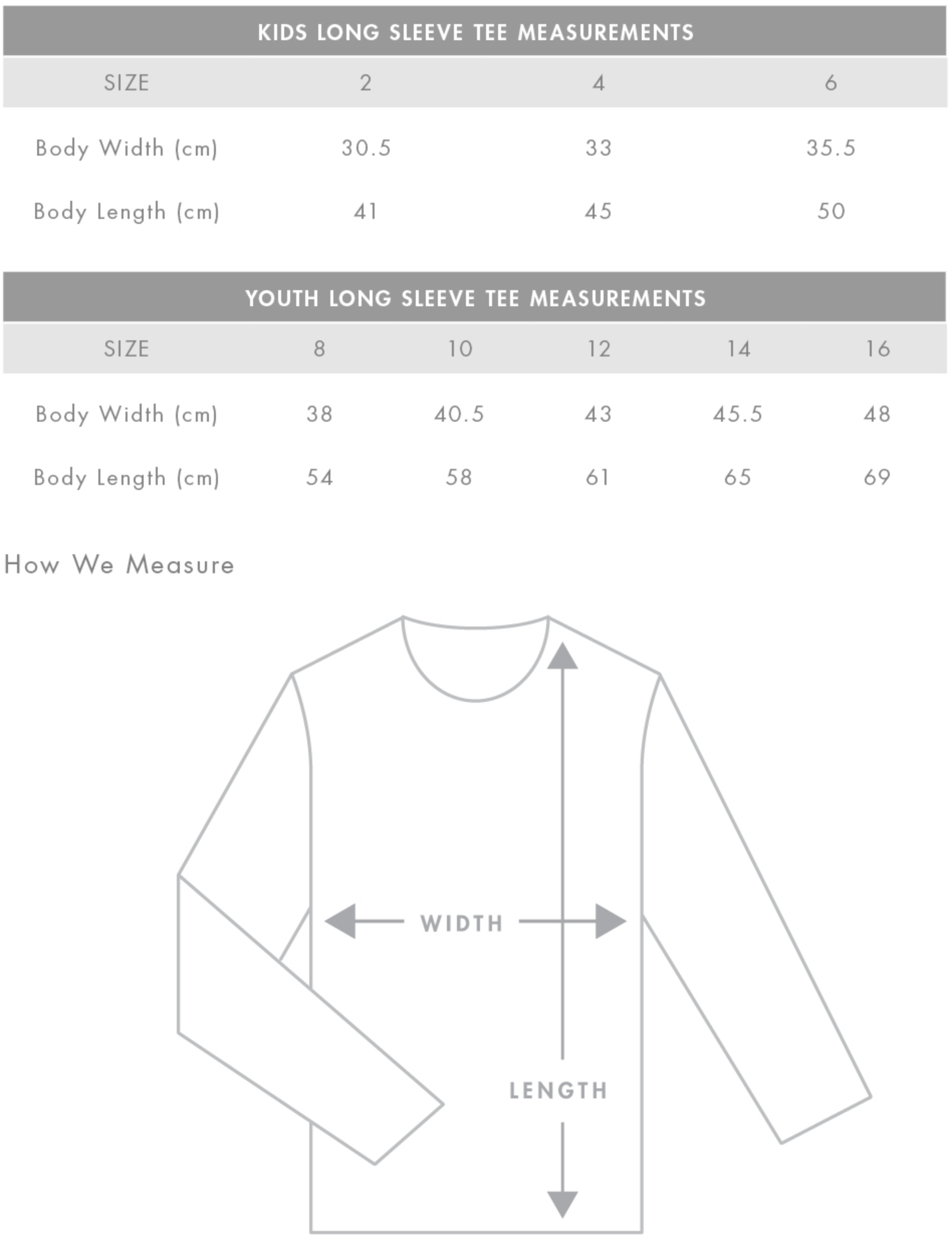 FIT: Regular fit - please check the size chart to avoid disappointment. Lay your own tee flat on a table, measure armpit to armpit across the chest and match to the size you feel is best. Please note measurements can vary within 2.5cm, this is within the accepted tolerance.
